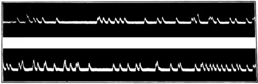 Examples of such photographic records, obtained by Rutherford and Geiger, are shown in Fig. 5. The vertical movements of the fiber from the horizontal line are due to the entrance of alpha particles, and it is seen how clearly the detailed movements of the fiber are registered. In some cases, one alpha particle follows another so rapidly that the