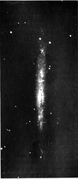 Fig. 11. The Spiral Nebula H. V. 41, Canum Venaticorum, seen edgewise, Photographed at the Lick Observatory. that it would be fairly circular in general outline if viewed from the poles of the Milky Way, or greatly elongated or spindle-shaped if the observer were in the plane of the Milky Way. We illustrate this point by means of well known spirals viewed broadside, and obliquely, and of the spindle-shaped nebulæ, which we do not doubt are spirals seen edgewise. Easton, the principal modern student of Milky Way structure, has even gone through the laborious task of assigning the stars, as seen from our viewpoint near the supposed center of the stellar system, to their assumed places in a spiral structure. But I need scarcely say that the subject is too vast for solution now, or in the near future. If our stellar system is one of a hundred thousand or more spiral nebulæ, we have at once the problem of determining the place of our stellar system in the larger universe of systems, necessarily beginning with the motion of our system as a whole with reference to the great numbers of surrounding systems.