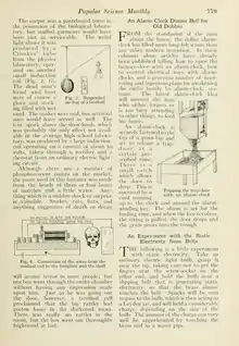 The corpse was a pasteboard torso in the possession of the biological laboratory, but stuffed garments would have been just as serviceable. The weird light above it was produced by a Crooke's tube from the physics laboratory, operated on another small induction coil (Fig. 2, G). The dead man's hand and foot were of course a glove and stocking filled with wet sand. The snakes were real, but artificial ones would have served as well. The 6-in. spark above the door-knob, which was probably the only effect not available in the average high school laboratory, was produced by a large induction-coil operating on a current of about 50 volts, taken through a rectifier and a rheostat from an ordinary electric lighting circuit.