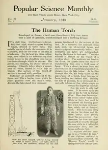 people, fascinated by the actions of the two. In a moment, the assistant steps back from the oil-covered figure and shouts a signal to somebody below. Immediately all lights are extinguished, leaving the figure in darkness. Then the stillness is broken by the report of a revolver shot. The assistant has fired at the diver, the sparks from the revolver transforming him into a livid cone of flame. With a shout, he leaps from the platform and in a beautiful parabolic dive, plunges into the lake below. As he flies through the air, his body takes on the appearance of a torch, long tongues of flame trailing out behind him. Striking the film of gasoline, he is enveloped in a veritable inferno of fire, which erupts as soon as his fingertips touch it.