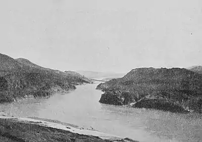 The Indus in British India.— After reaching British India the Indus soon becomes the boundary dividing Hazara and Peshawar, two districts of the North West Frontier Province. Lower down it parts Peshawar from the Panjab district of Attock. In this section after a time the hills recede on both sides, and the stream is wide and so shallow that it is fordable in places in the cold weather. There are islands, ferry boats and rafts