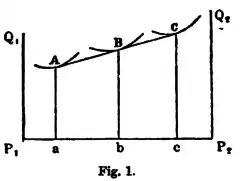 The effect of a change of pressure while the temperature remains constant may be found in a manner entirely analogous. The variation of any ordinate will be or . Therefore, if the volume of the homogeneous phase represented by the point is greater than the volume of the same matter divided between the phases represented by and , an increase of pressure will give a diagram indicating that all phases of the sort represented by curve