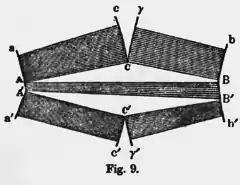But if, when the primitive surface is constructed for such a temperature and pressure that it has three points of contact with the same plane in the same straight line, the sheet (which has the middle position) at its point of contact with the triple tangent plane intersects the developable surface formed upon the other sheets and , the surface of dissipated energy will not include this developable surface, but will consist of portions of the three primitive sheets with two developable surfaces formed on and and on and These developable surfaces meet one another at the point of contact of with the triple tangent plane, dividing the portion of this sheet which belongs to the surface of dissipated energy into two parts. If now the temperature or pressure are varied so as to make the sheet sink relatively to the developable surface formed on and the only alteration in the general features of the surface of dissipated energy will be that the developable surfaces formed on and and on and will separate from one another, and the two parts of the sheet will be merged in one. But a contrary variation of temperature or pressure will give a surface of dissipated energy such as is represented in figure (9), containing two plane triangles belonging to triple tangent planes, a portion of the sheet on the left of the line , a portion of the sheet on the right of the line , two separate portions and of the sheet , two separate portions and of the developable surface formed on and , two separate portions and of the developable surface formed on and , and the portion of the developable surface formed on and .