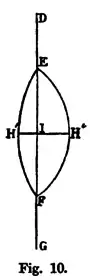 It will be convenient to consider first a lentiform mass of phase in equilibrium between masses of phases and which meet in a plane surface. Let figure 10 represent a section of such a system through the centers of the spherical surfaces, the mass of phase lying on the left of , and that of phase on the right of . Let the line joining the centers cut the spherical surfaces in and , and the plane of the surface of contact of and in . Let the radii of and be denoted by , and the segments , by . Also let , the radius of the circle in which the spherical surfaces intersect, be denoted by . By a suitable application of the general condition of equilibrium we may easily obtain the equation