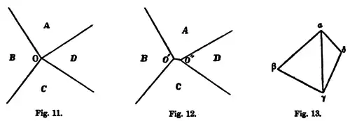 To fix our ideas, let us suppose that there are four homogeneous masses , and , which meet one another in four surfaces, which we may call , and , these surfaces all meeting along a line . This is indicated in figure 11 by a section of the