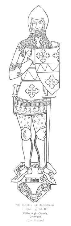 [Aldeburgh, Sir William de, of Aldeburgh, Yorkshire, 1360 — bore, a fess dancette from point to point, between three crosses crosslet (now called botonnée) an annulet for difterence. See Monumental Brass.]