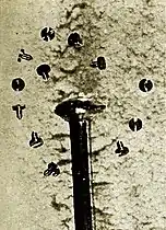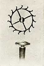 | Twelve tiny screws and six jewel-pins. | An escape-wheel. | An escape-pinion. | |