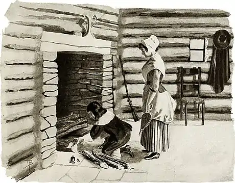 The old-time method of building a fire in a log-cabin.