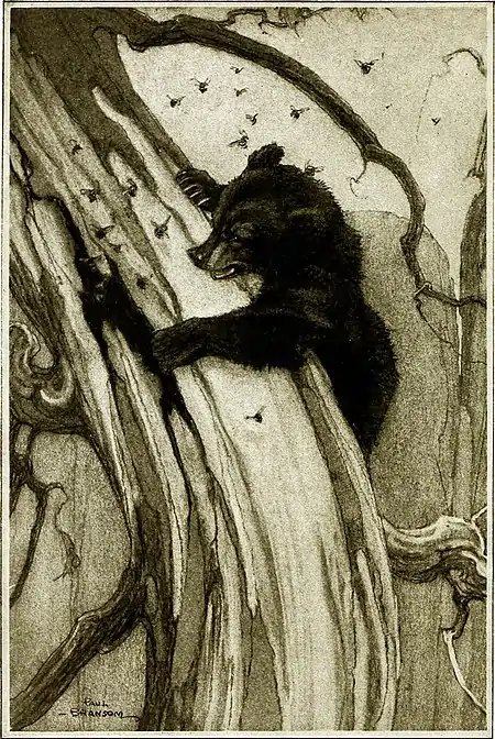 “‘HE REACHED AROUND, DUG HIS CLAWS INTO THE EDGE OF THE BEES’ HOLE, AND PULLED WITH ALL HIS MIGHT.’” (SEE PAGE 235.)