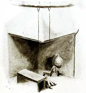 The hood is held in place by ropes about a pole. In the foreground is shown a slab for baking cakes, with place for a fire under it. At the back a stone supports a pot holding it above the fire.