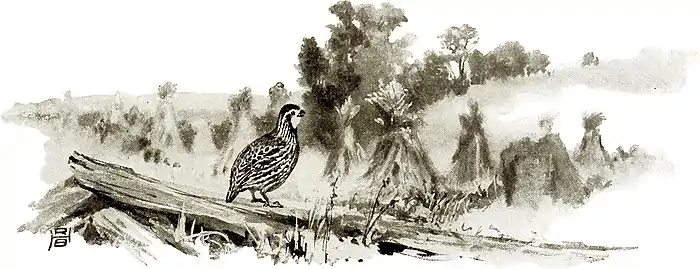BOB-WHITE (Autumn) When the days are growing shorter, And the nights are growing chill, And the green turns red and gold, In the wood, and on the wold, O’er the meadow, and the hill, Then, to hearts for summer sad, Sounds a message brave and glad: ' “All ’s light, All ’s bright, All ’s right, Bob-white.”’ |