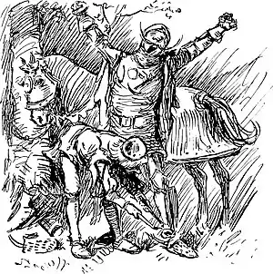 One evening, when wearied with toils of the chase— An evening of bright hunter’s moontime— Our hero drew rein in a still, woodsy place, Where fain would he rest him, and slumber a space, Having slain ninety monsters since noontime. His chestnut he tied to a horse-chestnut tree, (A natural bond of connection), Then, having his armor-canned body pried free, His limbs he outstretched, and with yawns, one, two, three, Set forward in Nodland’s direction; And soon, in rich baritone tones, Snored Sir Christopher Jenkinson Jones. |