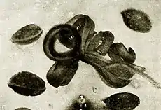 THE PODS OF THE TOUCH-ME-NOT AS WE FIND THEM IN LATE AUTUMN. may be imagination, but it has always seemed to me that Impatiens is particularly fond of any structure that crosses a brook, as a bridge or a fence, especially an old stone wall. At the edge of the bridge, or on one of the projecting stones of the old wall, I have often amused myself by touching these irritable pods. No matter how many times you may have done it, you want to try just once more, and invariably they startle you, though you may know just what they will do. They pop so suddenly that no amount of anticipation will find you prepared for the explosion. Their conduct is the more fascinating because they look so innocent; they appear to have no intention other than that of any sedate seed-vessel, but, at a certain stage of their development,