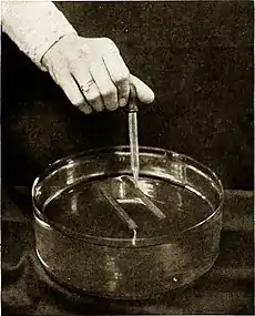 DROPPING ALCOHOL BETWEEN TWO STICKS TO WEAKEN THE SURFACE FILM OF THE WATER. contracting. If you will dip a camel’s-hair brush into water and then withdraw it, you will see that the slender bristles are all drawn down together to a point. This is due to the fact that the water clinging to the brush is drawn inward by the contracting of the outside surface film. We make use of this phenomenon when we moisten the end of a thread before putting it through the eye of a needle.