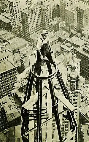 “At first we had a man stand at the edge of the building on the floor where the work was going on; he sent signals to the engineer by pulling a rope that rang a bell. Now that the building has reached such a height, we have the signals sent from the ground to the man on the floor where the derrick is set, by electricity. He in turn touches a button that communicates the signal to the engineer.”