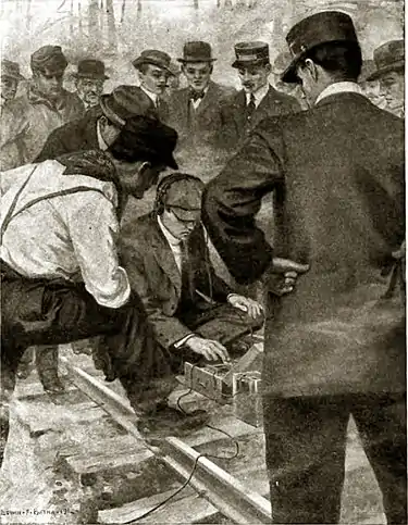 “Then slowly and steadily he began calling.” (See page 425.) Scott and the station-master followed. As they stepped out upon the platform, a wave of heat smote them. They dropped to the ground, and peered ahead through the fog of smoke. On the right-hand side of the track, the woods were on fire; and, as far as they could see ahead, lay a line of prostrate telegraph-poles, still burning.