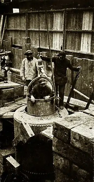 GOING DOWN TO WORK IN THE SAND BUCKET. MEN ARE SUPPOSED TO USE THE LADDER.