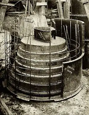 SETTING UP THE FORMS AND REINFORCING BARS FOR CASTING A CONCRETE WORKING CHAMBER.