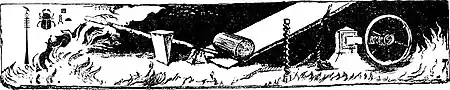 In the meantime, Danny Roach had taken in the situation. There was a bucket nearly filled with sand standing beside the burning oakum and almost enveloped in the flames. He reached for the signal rope, gave a signal, in response to which the bucket was lifted three feet off the ground, then, rushing through the flames, he kicked the trip of the bucket. A ton of sand poured out over the blazing oakum and smothered the fire. Danny Roach’s clothes were afire, and he rolled around on the ground, trying to quench the flames. It was with difficulty that we extinguished the blaze, and poor Danny was very painfully burned. He was placed as tenderly as possible in the sand bucket, and, with the gang boss attending him, was hauled up to the surface.