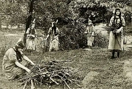 The symbol of the Camp-Fire Girls is also admirable. It is fire, as one would naturally expect from the term, and the fire means more than the ordinary flame for cooking or heating. The intense heat of fire is a symbol of enthusiasm. Anything that is worth doing at all is worth doing well and heartily. We are inspired to good works by seeing the work of others, and here is the first step in the life of a Camp-Fire Girl. She never finds the fire ready-made. She must learn to be independent of every one else. The first degree is that of wood-gatherer, and the emblem, crossed logs. She must go alone when the others go, each into her own section of the woods, to find her contribution to the general