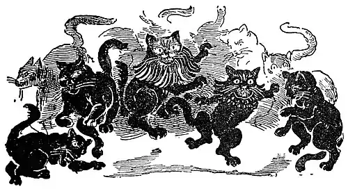 Now just as they were at the fastest, the same cat which had tried so often to upset the pot, stuck her paw inside the circle, as though she meant to claw the tailor. But as soon as the tailor saw that, he drew his knife out of the sheath and held it ready; just then the cat thrust her paw in again, and in a trice the tailor chopped it off, and then, pop! all the cats took to their heels as fast as they could, with yells and caterwauls, right out at the door.