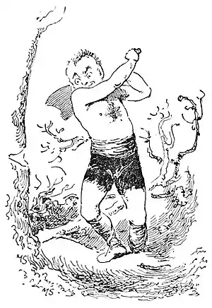 Grumblegizzard went off to the smithy, and got the smith to help him to make an axe of fifteen pounds of iron; and so he went into the forest and began to clear it; down toppled tall spruces and firs fit for masts. Everything went down that he found either on the king's or his neighbour's ground; he did not stay to top or lop them, and there they lay like so many windfalls. Then he laid a good load on a sledge, and put all the horses to it, but they could not stir the load from the spot, and when he took them by the heads and wished to set them a-going, he pulled their heads off. Then he tumbled the horses out of the traces on to the ground, and drew the load home by himself.