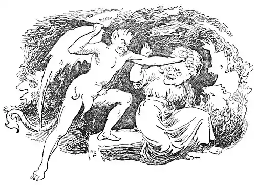 used his wings, while Grumblegizzard had to keep to the ground under the weight of the big scrip; but, just as Old Nick was at his heels, he began to run and jump as fast as he could; and he held his club behind him to keep Old Nick off.