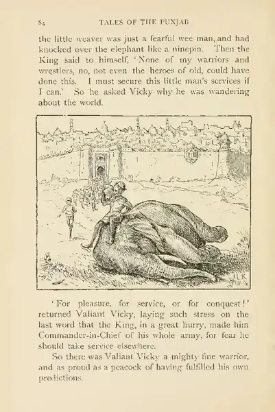 the little weaver was just a fearful wee man, and had knocked over the elephant like a ninepin.Then the King said to himself, 'None of my warriors and wrestlers, no, not even the heroes of old, could have done this.I must secure this little man's services if I can.'So he asked Vicky why he was wandering about the world.
