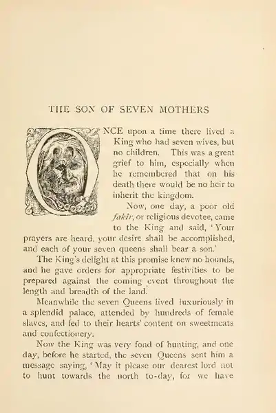 Now, one day, a poor old fakîr, on religion devotee, cae to the King and said, 'Your prayers are heard, your desire shall be accomplished, and each of your seven queens shall bear a son.'