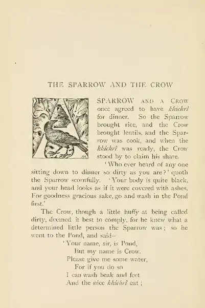 SPARROW AND A CROW once agreed to have khichri for dinner. So the Sparrow brought rice, and the Crow brought lentils, and the Sparrow was cook, and when the khichri was ready, the Crow stood by to claim his share.