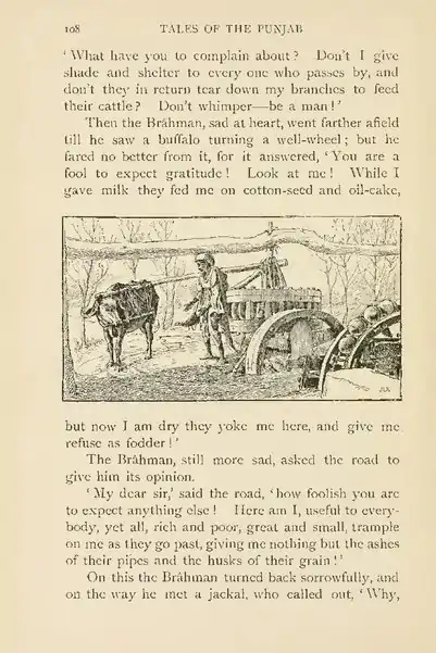 Then the Brâhman, sad at heart went farther afield till he saw a buffalo turning a well-wheel; but he fared no better from it, for it answered, 'You are a fool to expect gratitude!Look at me!While I gave milk they fed me on cotton- seed and oil-cake,
