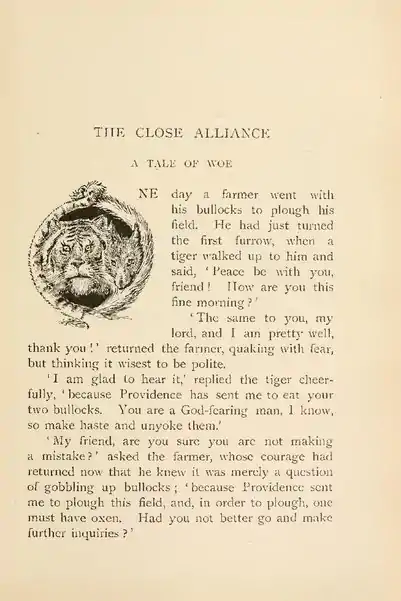'I am glad to hear it,' replied the tiger cheerfully, 'because Providence has sent me to eat your two bullocks.You are a God-fearing man, I know, so make haste and unyoke them.'