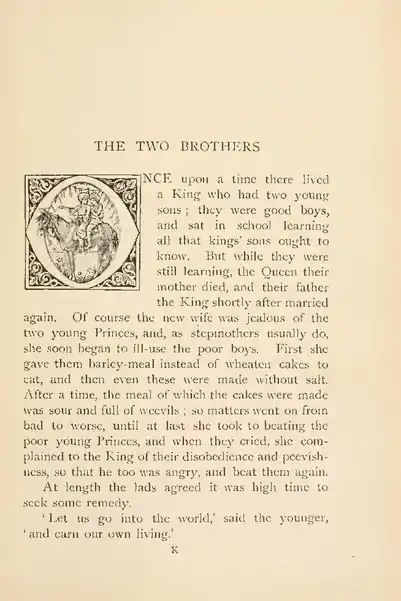 NCE upon a time there lived a King who had two young sons; they were good boys, and sat in school learning all that king's sons ought to know,Bur while they were still learning, the Queen their mother died, and their mother died, and their father the King shortly after married again.Of course the new wife was jealous of the two young Princes, and, as stepmothers usually do, she soon began to ill-use the poor boys.First she gave them barley-meal instead of wheaten cakes to cat, and then even these were made without salt.After a time, the meal of which the cakes were made was sour and full of weevils; so matters went on from bad to worse, until at last she took to beating the poor young Princes, and when they cried, she complained to the King of their disobedience and peevishness, so that he too was angry, and beat them again.