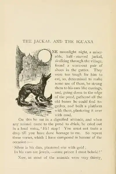 NE moonlight night, a miserable half-starved jackal, skulking through the village, found a worn-out pair of shoes in the gutter.They were too tough for him to eat, so, determined to make some use of them, he strung them to his ears like earrings, and, going down to the edge of the pond, gathered all the old bones he could find together, and built a platform with them, plastering it over with mud.