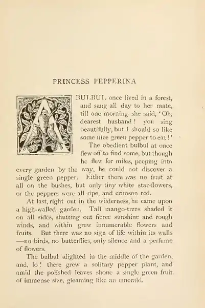 BULBUL once lived in a forest and sang all day to her mate, till one morning she said, 'Oh dearest husband!you sing beautifully, but I should so like some nice green pepper to eat!'