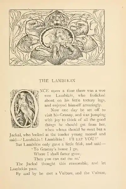 NCE Upon a time there was a wee wee Lambikin, who frolicked about on his little tottery legs, and enjoyed himself amazingly. Now one day he set off to