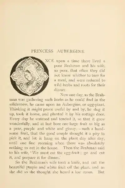 Now one day, as the Brahman was gathering such herbs as he could find in the wilderness, he came upon an Aubergine, or egg-plant. Thinking it might prove useful by and by, he dug it up, took it home, and planted it by his cottage door. Every day he watered and tended it, so that it grew wonderfully, and at last bore one large fruit as big as a pear, purple and white and glossy,such a handsome fruit, that the good couple thought it a pity to pick it, and let it hang on the plant day after day, until one fine morning when there was absolutely nothing to eat in the house. Then the Brahman said to his wife, 'We must eat the egg-fruit; go and cut it, and prepare it for dinner.'