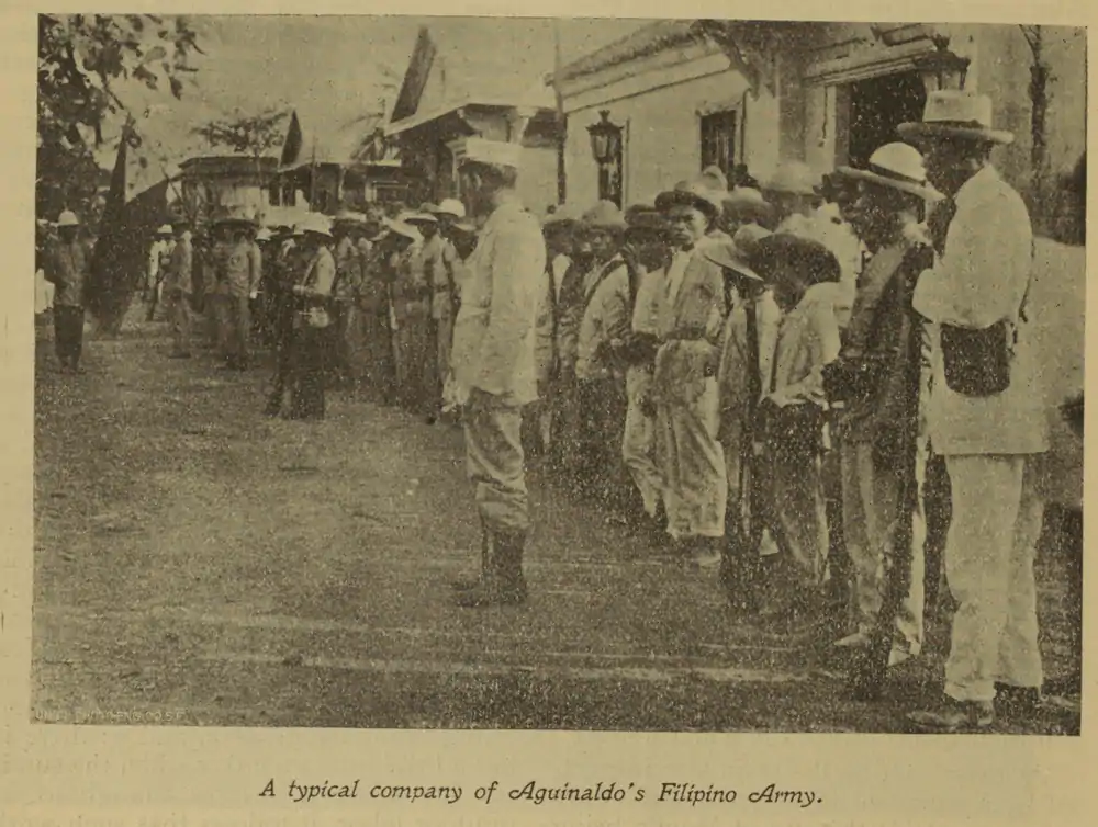 There was a large crowd assembled at the San Fernando station when we arrived. An elegant carriage, drawn by four gaily caparisoned and decorated white horses, was in waiting for President Aguinaldo, while the Calle Real (the royal road, as the main thoroughfare everywhere is invariably called) was lined with soldiers, who faced inwards from opposite sides of the street, the men. being at intervals of about five yards, and the line extending along a distance of nearly two miles. Between these lines we drove in the fine carriages our host, who had gone up the day before, had