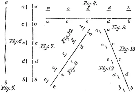 To draw a line at random, without a previous arrangement, trusting more to good luck than to skill for its being correct, and leaving out all consideration or inquiry as to its fitness until it is drawn, is the most discouraging practice that can be followed. Let the student make up his mind, before he attempts to draw the line, where it is to begin, and where it is to end. Take a single line for an example (Fig. 6). Let it be supposed it is to begin at a and end at b; make a point where it is to begin and another where it is to end, and follow this practice invariably, whatever the subject may be, and whatever may be the number of lines that compose it. If the line be too long to draw at once without leaving off, mark any number of points in the direction between the two points a and b, and mark those points first which are nearest the extremes (the order of the letters in Fig. 6 will explain this), ending with those near the centre. When these points are properly placed so as to be in a straight direction, join a to c by one continued and carefully drawn line that is, without leaving off (observing what has been already said about the position of the pencil); then draw a line from c to e, from e to d, and from d to b, as in Fig. 7. By this process of marking in the distances where there is a combination of lines, we overcome one, if not the greatest, difficulty in free-hand drawing. There are other helps for placing lines correctly, all of which will be noticed in their due course. This method of drawing a line must be practised over and over again until it is accomplished. Then in the same way draw lines in a horizontal position, as in Figs. 8 and 9; then again inclined lines, as in Figs. 10 and 11, 12 and 13.