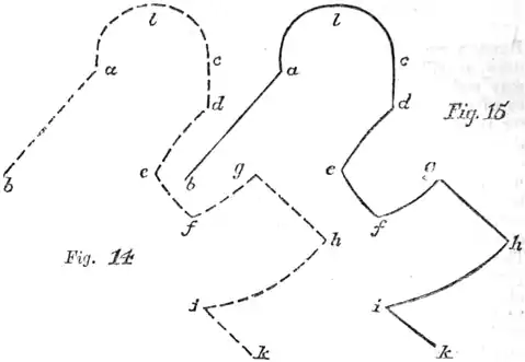 Figs. 14 and 15 may appear to be only a piece of scribble, yet they contain all that is necessary for the purpose of illustrating our meaning. First, then, observe the position of a with regard to b (Fig. 14), and their distance from each other, and place points to correspond, as a and b in Fig. 15; and also the positions of the other characteristic points respectively—l with regard to a being in a direct line with a and b, c with regard to l and a; also d perpendicular with c, and so on; e and g on the same level, e being perpendicularly under l, i under f, and k somewhat below the position of i under g. When all these characteristic points and distances are determined, then, as in the drawing of a simple line (as before explained), join these points by lines straight and curved as in the example, Fig. 14, producing the result as in Fig. 15. Respecting the importance of this fundamental principle, we cannot too earnestly impress it upon the mind of the pupil, and recommend him to practise it frequently.