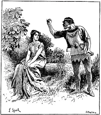 She found the turkey-maiden sitting upon a big stone, barefooted, and miserably dressed in an old, coarse linen gown and cap; the