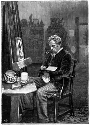 In the morning-room are many artistic treasures. The furniture is all black, relieved with red, and there are some fine Chippendale chairs and an old Dutch cabinet; while in front of the fender is a huge Chinese umbrella, on which Mr. Marks has painted number of great black fishes, apparently swimming round and round. The piano, too, is a curiosity, being beautifully painted by the artist to represent the orchestra of the Muses. The pictures here are exceedingly interesting. Here is a study of the back of Mr. Marks' head, done by his drawing-master in 1856. Here, too, is the only thing which the artist has ever had the luck to win in a raffle. It was in 1865, at which time a number of artists in St. John's Wood had formed themselves into a little society known as "The Gridiron," for the purpose of criticising one another's pictures. The little sketch—a pictorial skit—hits off very happily the members of the Gridiron Society. Mr. Fred Walker is taking a walk on a cliff, surrounded by numbers of ghosts. Mr. Yeames, who had just got married, is shown with a wedding ring in his hand. Mr. J. E. Hodson, eminent for his Elizabethan pictures, is shown with a huge ruff around his neck; and Mr. Marks is with his old friend, Mr. Calderon, floating along together, each with a gridiron on his breast. The picture is signed "F. W., Torquay Asylum, 1865." It was raffled for at Mr. Walker's house, and Mr. Marks won the treasure.