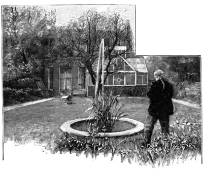 Mr. Marks then puts on his hat, and we pass through a smaller studio and glass-house, the former containing a very curious cabinet, which he painted some years ago, depicting a nursery tale, "Sing a Song of Sixpence"; and there is the king counting out his money, and the blackbird descending and pecking off the maid's nose, the Queen eating honey, the pie open before the King with the twenty-four blackbirds. This goes round the four sides of the cabinet, which is used for brushes, colours, varnishes, &c. Passing into the garden there is the pet jay, in his cage by the tree; the fountain is playing; and Tommy, the tortoise, is crawling