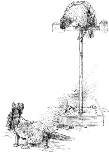 But of all cat stories I know, the best is one told by Théophile Gautier, who has written concerning cats with an understanding and a feeling unsurpassed. He kept many cats, a chief favourite among which was "Madame Théophile," a "red" cat, with a white breast, a pink nose, and blue eyes. "She slept," says he, "at the foot of my bed; she sat on the arm of my chair while I wrote; she came down into the garden and gravely walked about with me; she was present at all my meals, and frequently intercepted a choice morsel on its way from my plate to my mouth. One day, a friend who was going away for a short time, brought me his parrot to be taken care of during his absence. The bird, finding itself in a strange place, climbed up to the top of its perch by the aid of its beak, and rolled its eyes (as yellow as the nails in my arm-chair) in a rather frightened manner, moving also the white membranes that formed its eyelids. 'Madame Théophile' had never seen a parrot before, and she regarded the creature with manifest surprise. While remaining as motionless as a cat-mummy from Egypt in its swathing-bands, she fixed her eyes upon the bird with a look of profound meditation, summoning up all the notions of natural history that she had picked up in the yard, in the garden, and on the roof. The shadow of her thoughts passed over her changing eyes, and one could plainly read in them the conclusion to which her scrutiny led:—'Certainly this is a green chicken.' This result attained, the next proceeding of 'Madame Théophile' was to jump off the table from which she had made her observations, and lay herself flat on the floor in a corner of the room, exactly in the attitude of a panther watching the gazelles as they come down to drink at a lake. The parrot followed the movements of the cat with feverish anxiety; it ruffled its feathers, rattled its chain, lifted one of its feet and shook the claws, and rubbed its beak against the edge of its trough. Instinct told it that the cat was an enemy, and meant mischief. The cat's eyes were now fixed upon the bird with fascinating intensity, and they said in perfectly intelligible language, which the poor parrot distinctly understood:—'This chicken should be good to eat, although it is green.' We watched the scene with great interest, ready to interfere at need. 'Madame Théophile' was creeping nearer and nearer, almost imperceptibly; her pink nose quivered, her eyes were half closed, her contractile claws moved in and out of their velvet sheaths, slight thrills of pleasure ran along her back-bone at the idea of the meal she was about to make. Such novel and exotic food excited her appetite. In an instant her back took the shape of a bent bow, and with a vigorous and elastic bound she sprang upon the perch.