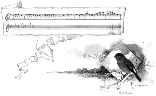 The bullfinch in its natural state is by no means remarkable as a songster, but its power of imitation is so remarkable that it can be taught to pipe tunes with the sweetness and intonation of a clarionet. In Germany, where the finest piping bullfinches come from, boys are employed to pipe to the birds the whole day long. The consequence is that most of the bullfinches heard here pipe German airs. The two "free" tunes mostly affected in this country are "The Mousetrap" and "Polly Perkins," and these the birds will pipe perfectly as to time and tune. The teacher keeps his birds separate, and plays the tune to be learned on a flageolet or a bird-organ—preferably the former, as the bird-organ, while giving a mechanical precision of note, gives also a total absence of feeling. If they are permitted to hear other birds while being taught, they are apt to jumble up foreign notes with the air which they are learning, in a most absurd manner.