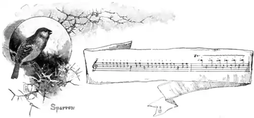 The sparrow is by no means a contemptible songster, its strain being soft, sweet, and varied. Its lively chirp is heard from first thing in the morning; and they often unite in a chattering chorus. It is but a note and a grace note, uttered first by one and then another; but the ensemble is pretty and musical.