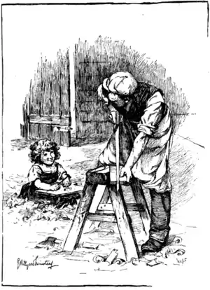 radiant with sunshine. She prattled to him as he worked at the bench; had her own hammer and her own piece of wood to knock imaginary tacks in; and began to be ambitious of the use of chisel and saw—an ambition which Sim would artfully counteract by the opportune provision of