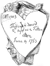 From the school-rooms let us go to the museum, where are stored some valuables and many curiosities. Pictures by Hogarth and others line the walls, and it is an interesting item of information that the Royal Academy of Arts, to which the fashionable world flocks to-day, was suggested to the founders by the crowds of people who in the last century went to see the pictures exhibited at the Foundling Hospital. Artists rallied strongly to the support of the institution, which also enlisted the services of Handel, who devoted his "Messiah" to its benefit, and presented the organ which is still in use. Lovers of art history and art treasures will find much on the walls and in the show-cases of the Foundling Hospital to gratify them. What will attract the majority of people more, however, than Handel's gifts, or Hogarth's or Sir Joshua Reynolds' canvases, are the tokens which it early became necessary to stipulate should be left with the child for the purpose, if need be, of identification. All sorts of things were left, from a coin or a key to a trinket or a piece of ribbon. Hearts and wedding rings are numerous, the former, no doubt, emblems more often than not of broken hearts, the latter eloquent of disappointed hopes. In some instances the token took the shape of verse.