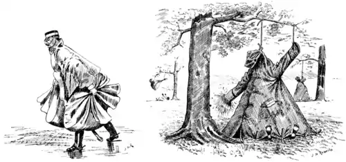 Another tent coat is formed by buttoning three coats together, each one being one-third of a circle in shape. Such a tent would be all very well for two of the men, but the third, I am afraid, would have to sit outside, to say nothing of the dog, supposing there was one.