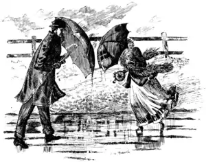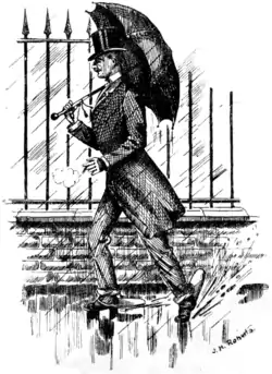 The next umbrella, to use a vulgarism, "takes the cake." It is one provided with windows, so that the occupant or user thereof can see where he is going. Thanks to this umbrella, a collision is avoided (Fig. 11).